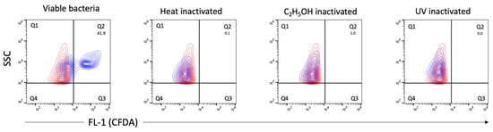 Measurements of esterase activity by CFDA staining. Representative contour plots of viable, heat-, C2H5OH- and UV-inactivated C. trachomatis (serovar E) EB/RB preparations. CFDA-positive, esterase-producing bacteria are shown in blue and detected in gate quadrant 2 (Q2), the numbers represent percentages of viable bacteria. PBS stained with CFDA as a reagent control is shown in red. Threshold settings: SSC 1000.