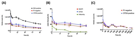 Moreover, by flow cytometry, we also analyzed C. trachomatis samples over a time course of 96 h and compared the particle counts per mL (Figure 8A). There was a significant decrease in the number of particles over this time from 1.27 × 106/mL to 4.86 × 105/mL, probably due to decay of EBs or aggregation of single particles. This decline must be considered when calculating percentages of metabolically active particles as fractions of DPCs. The viability stains analyzed over a time course of 48 h showed the strongest decrease within the first six hours, from 38.0% to 22.3% and from 27.0% to 19.6% for CFDA and SGI/PI, respectively (Figure 8B). In addition, esterase activity and membrane integrity measured by flow cytometry were aligned with infectivity, which is defined as the ratio between IFUs and the DPCs measured by epifluorescence microscopy. The infectivity of freshly thawed stocks was 15.4% at baseline and already decreased to below 1% after 24 h. This was in contrast to both viability stains measured by flow cytometry, which remained stable after six hours and did not fall below 16% within 48 h (Figure 8B).