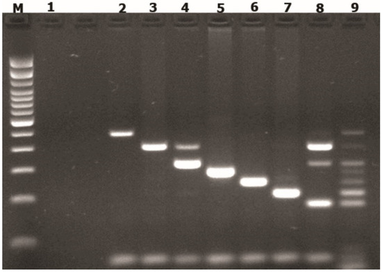 The single PCR reactions were carried out using QIAGEN® Multiplex PCR Kit (206145, Qiagen, Hilden, Germany), in a final volume of 10 µL prepared with PCR master mix buffer [1×]f, and 2 µL, (~100 ng/µL) of total nucleic acid extraction. Due to the variability of the Tm of primers, and to increase the specificity, we performed a touch-down PCR with a Hot Start activation step at 95 °C for 5 min; followed by 35-cycle steps, consisting of denaturation step at 95 °C for 1 min, after, the first 16 cycles at 65 °C for 1 min; for the next 19 cycles, the annealing temperature decreased 0.3 °C each. The extension step was at 72 °C for 45 s. The PCR steps were carried out using a standard Veriti™ Thermal Cycler (LS4375786, Thermo Fisher Scientific, Waltham, MA, USA).