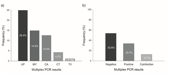 Results of multiplex PCR by pathogens. (a) Pathogens detected by multiplex PCR. (b) Frequency of positive and coinfection results. Abbreviations: UP, Ureaplasma spp.; MY, Mycoplasma spp.; CA, Candida spp.; CT, Chlamydia trachomatis; TV, Trichomonas vaginalis.
