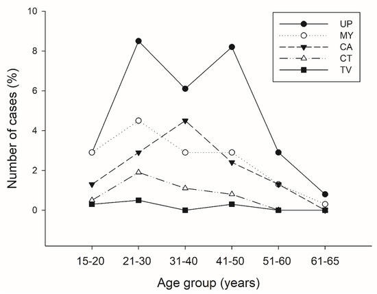 Pathogens detected by multiplex PCR stratified by age 15–20, 21–30, 31–40, 41–50, 51–60, 61–65 years. Abbreviations: UP, Ureaplasma spp.; MY, Mycoplasma spp.; CA, Candida spp.; CT, Chlamydia trachomatis; TV, Trichomonas vaginalis.