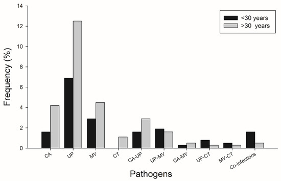 We compared two different age groups, less than 30 years and above 30 years, with the multiplex PCR results (Figure 4). The most frequent microorganisms detected were Candida spp., Ureaplasma spp., Mycoplasma spp., and Chlamydia trachomatis in women older than 30 years. In the case of coinfection, the positive results were more frequent in women younger than 30 years of age (Figure 4).