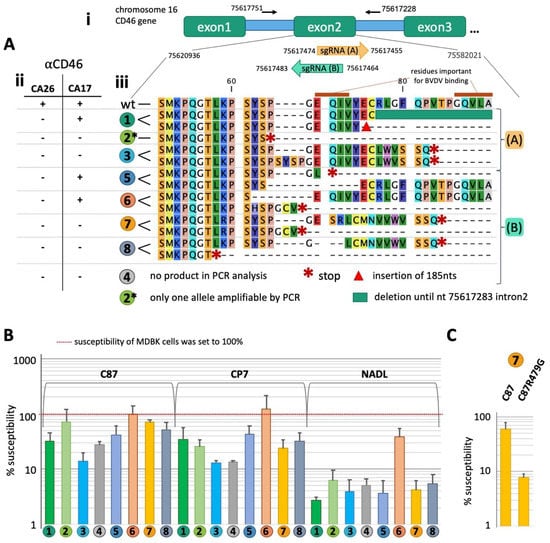 Genotype of generated MDBK CD46 knock-out cell lines and susceptibility to different BVDV-1 strains. (A) (i) Localization of the sgRNAs and the primers used for amplification of the modified region by PCR on the CD46 gene. (ii) Reactivity of the cell lines with anti-CD46 antibodies CA17 and CA26. − indicates no reactivity, + indicates reactivity. (iii) Effect of modifications within the CD46 alleles on the expressed protein. Stop codons are indicated by red asterisk. Residues important for BVDV E2 binding according to [11] are indicated. Wt = unmodified MDBK cells. (B) Susceptibility of the different clones to BVDV-1 strains C87, CP7, and NADL in comparison to the parental MDBK cell line. The average and standard deviation of three independent experiments are depicted. Color code and clone numbering is according to (A-iii). (C) Effect of the susceptibility of clone 7 to C87 and C87 encoding a G at position 479 of the polyprotein (C87R479G).