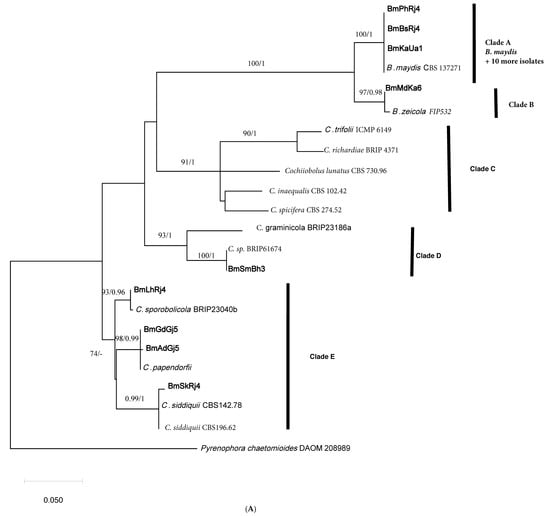 The remaining taxa in the tree were Curvularia sp. isolates and they formed three main supported clades C, D, and E. (Figure 1A). Clades C, D, and E had a polytomy relationship to each other and to Bipolaris clades B and A. (Figure 1A). Within clade E, isolates BmAdGj5 and BmGdGj5 and ex-type culture of C. papendorfii had identical sequences, and together they formed a highly supported subclade (BS = 98% and PP = 0.99 subclade). Isolate BmLhRj4 had an identical sequence to an ex-type culture of C. sporobolicola, and together they formed a highly supported subclade. Isolate BmSkRj4 formed a subclade with two isolates of C. siddiquii, with high support (BS = 0.99 and PP = 1). In the ITS tree, however, the isolates that fell into clade E (BmLhRj4, BmGdGj5, BmAdGj5, and BmSkRj4) formed a highly supported clade with C. lunata and they all had identical ITS sequences. Clearly, phylogeny based on ITS sequence data appears to be unsuccessful in resolving Curvularia isolates to the species level like the GAPDH tree. Isolate BmSmBh3 (Figure 1A) formed a clade with the sequence of the unidentified species of Curvularia (Accession No. KU552166). The species C. graminicola was shown to be the closest relative to them (Clade D, Figure 1A). Therefore, this unidentified species remained ambiguous, needs additional markers-based phylogeny for clarity, and was named C. graminicola-like fungus for this report. In the ITS tree, isolate BmSmBh3 fell into the large Curvularia clade but did not form a clade with a sequence of any known species of Curvularia.