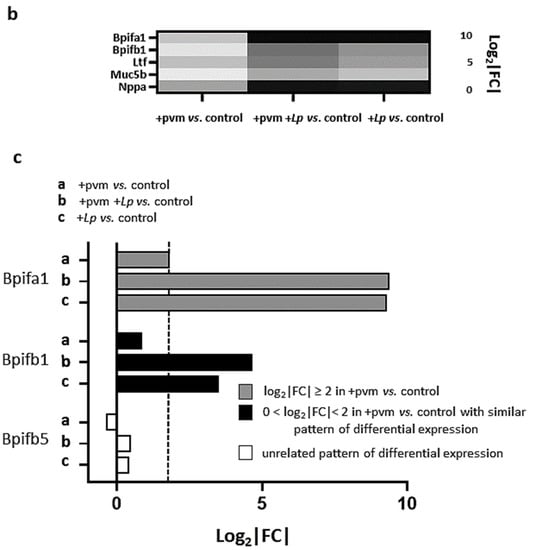Bpifa1 and Bpifb1 were also up-regulated (600- and 11-fold, respectively) in response to L. plantarum; these mediators are specifically expressed in respiratory epithelial cells and encode proteins that interact with bacteria []. We observed a minimal differential regulation of Bpifb5 (Figure 2c) and no differential regulation of any of the other members of this specific gene family. Interestingly, Akram and colleagues [] found that endogenous Bpifa1 (and also Muc5b) served to limit the replication of influenza A/H3N2 in a tracheal air–liquid interface cell culture model. A future study might address the potential roles of Bpifa1 and Bpifb1 in limiting the inflammatory sequelae of PVM infection.