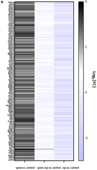 As anticipated from previous studies [,,,,], the RNA sequencing data revealed profound differential expression of numerous genes involved in the inflammatory response. The results presented in Figure 2a document the differential expression of 55 genes associated with pro-inflammatory pathways, including Il6 (4-fold up-regulation in +pvm vs. control), a cytokine with profound adverse impact on the outcome of lethal PVM infection []. In contrast, we detected minimal (1.04-fold) up-regulation and 1.5-fold down-regulation of Il6 when comparing +pvm +Lp vs. control and +Lp alone vs. control, respectively. Other transcripts encoding pro-inflammatory genes identified as up-regulated in response to sublethal PVM infection and down-regulated in response to L. plantarum include those encoding Ccl2, Ccl8, Cxcl9, Cxcl10, and resistin-like molecule alpha (Retnla). While Retn1a (also known as FIZZ-1) has been identified as a critical regulator of allergic inflammation [,], Samarasinghe and colleagues [] reported that the direct administration of recombinant Retnla and Retnlb to the airways resulted in a significant reduction in host immune responses in mice infected with influenza A.