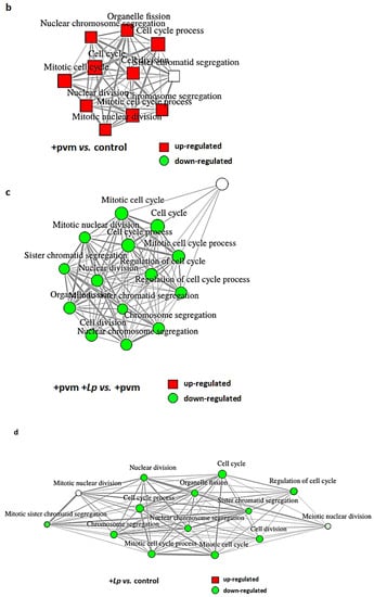 Successful recovery from an acute respiratory virus infection involves wide-ranging and dramatic changes throughout the lung tissue, most notably events and responses that support the repair and reconstruction of the respiratory epithelium [,]. As discussed in the first section above, day 14 of our protocol represents an early point in this recovery process; the virus was cleared from the lung tissue, and mice infected with PVM alone were gaining weight at a rate of ~1.7 g/day to recover homeostasis (see Figure 1b). Interestingly, we found that 131 of the 289 (45%) of the genes identified as up-regulated in response to PVM infection encode proteins that are directly associated with cell cycle regulation and mitosis (Figure 3a,b). Without exception, the expression of each of these 131 transcripts was diminished when comparing the responses of PVM-infected mice treated with L. plantarum (+pvm +Lp vs. control) to those of PVM-infected mice alone (+pvm vs. control; Figure 3c). Of particular interest, nearly all of these transcripts (128 of 131, or 98%) were down-regulated from baseline control levels in mice treated with L. plantarum alone (Figure 3d). The significance of this observation will be further considered in the Discussion.