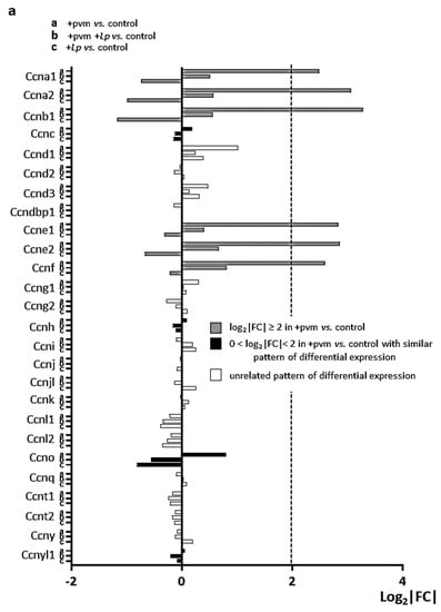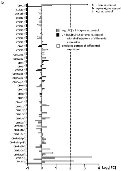 Cyclin-dependent kinases: Cyclin-dependent kinase (Cdk) genes encode several evolutionarily divergent subfamilies of proteins that interact with specific CCNs to regulate progression through the cell cycle [,,,]. The differential expression of 40 Cdk genes is shown in Figure 4b. Interestingly, PVM-infection alone results in the substantial up-regulation of only one CDK gene (Cdk1) and one CDK inhibitor (Cdkn3), and only minimal differential regulation of Cdk4, Cdk6, or Cdk8, which are genes that encode the specific partners of the aforementioned differentially regulated CCN genes. However, these results are consistent with findings reported in a review by Arellano and Moreno [] who noted that, unlike CCNs, CDK levels remain relatively constant throughout the cell cycle. Nonetheless, the expression of both Cdk1 and Cdkn3 were suppressed in PVM-infected mice treated with L. plantarum, and similar to the pattern described for the CCNs (see Figure 4a), expression levels of these genes fall below baseline in mice treated with L. plantarum alone. Of note, Cdk1 encodes a 34 kDa protein that interacts with CCNa and CCNb to promote the transition from S to G2 and G2 to M phases, respectively, and is the only CDK that is absolutely required for mammalian cell cycling [].