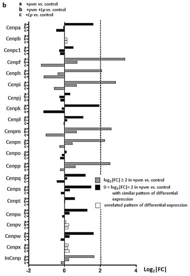 Differential expression of additional mitosis and cell cycle regulation gene families during recovery from an acute PVM infection. Expression of (a) kinesins (Kifs), (b) centromere proteins (Cenps), and (c) aurora kinases (Aurks) and their interacting partners in PVM-infected mice (+pvm), PVM-infected mice treated with L. plantarum (+pvm +Lp), and mice treated with L. plantarum alone (+Lp). Grey-filled bars represent transcripts that were up-regulated 4-fold or more (log2|FC| ≥ 2) in the +pvm vs. control group; black-filled bars represent transcripts that were up-regulated in the +pvm vs. control group and followed a similar differential expression pattern, although they did not reach the 4-fold threshold; white bars represent transcripts with an unrelated pattern of differential expression. Ensembl IDs, gene names, functional annotation, and fold-increases are listed in Supplementary Table S2 and GSE186740.