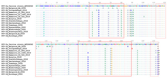 Complete alignment of CAP protein amino acid sequences of Russian PCV-2 strains. Multiple sequence alignment was performed using the Muscle method. The top line corresponds to the PCV-2a strain present in a commercial vaccine. Dots and hyphens represent identical amino acid positions and gapped positions, respectively. Asterisks represent stop codons Antibody recognition domains (A (51–81), B (113–134), C (161–208) and D (228–233)) are shown in red boxes.