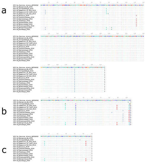 Complete alignment of nonstructural proteins’ amino acid sequences of Russian PCV-2 strains: (a) REP, (b) ORF3 and (c) ORF4. Multiple sequence alignment was performed using the Muscle method. The top line corresponds to the sequence of a PCV-2a strain used in a commercial vaccine. Dots and hyphens represent identical amino acid positions and gapped positions, respectively. Asterisks represent stop codons.