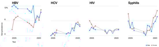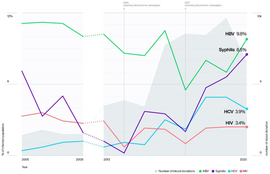- Yambasu, E.E.; Reid, A.; Owiti, P.; Manzi, M.; Murray, M.J.S.; Edwin, A.K. Hidden dangers-prevalence of blood borne pathogens, hepatitis B, C, HIV and syphilis, among blood donors in Sierra Leone in 2016: Opportunities for improvement: A retrospective, cross-sectional study. Pan Afr. Med. J. 2018, 30, 44. [Google Scholar] [CrossRef]