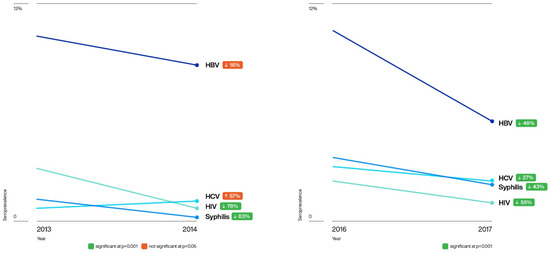 - Dirisu, J.O.; Alli, T.O.; Adegoke, A.O.; Osazuwa, F. A Survey of prevalence of serum antibodies to human immunodeficiency deficiency virus (HIV), hepatitis B virus (HBV) and hepatitis C virus (HCV) among blood donors. North Am. J. Med. Sci. 2011, 3, 35–38. [Google Scholar] [CrossRef] [PubMed]