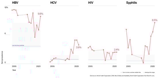 - M’Baya, B. Seroprevalence and trends in transfusion transmissible infections among voluntary non-remunerated blood donors at the Malawi Blood Transfusion Service-a time trend study. Malawi Med. J. 2019, 31, 118–125. [Google Scholar] [CrossRef]