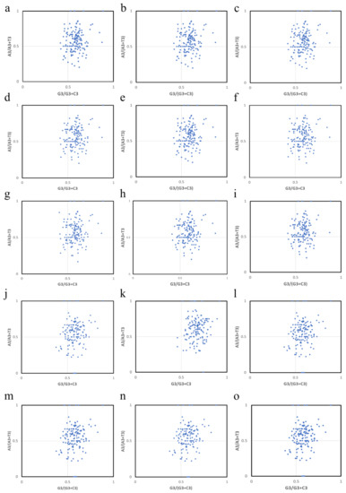 | Axis 3 | 0.2975 * | 0.2979 * | −0.1643 * | −0.3068 * | −0.3122 * | 0.2993 * | 0.2681 * | 0.0147 | |