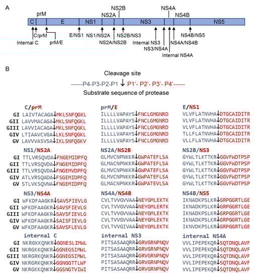 Cleavage sites predicted to be proteolytically processed by host cell and/or NS2B-NS3 proteases. (A) Schematic diagram of JEV polyprotein with the predicted cleavage sites. Arrowheads indicate the predicted cleavage sites. (B) Sequence alignment of the predicted cleavage sites for five genotypes of JEV. Arrowheads indicates the predicted cleavage sites.