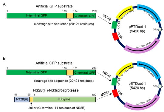 Schematic representation of recombinant plasmid. (A) Recombinant pETDuet-1 plasmid was engineered to express artificial GFP substrate at MCS2. (B) Recombinant pETDuet-1 plasmid was engineered to dually express NS2B(H)-NS3(pro) protease and artificial GFP substrate at MCS1 and MCS2, respectively.