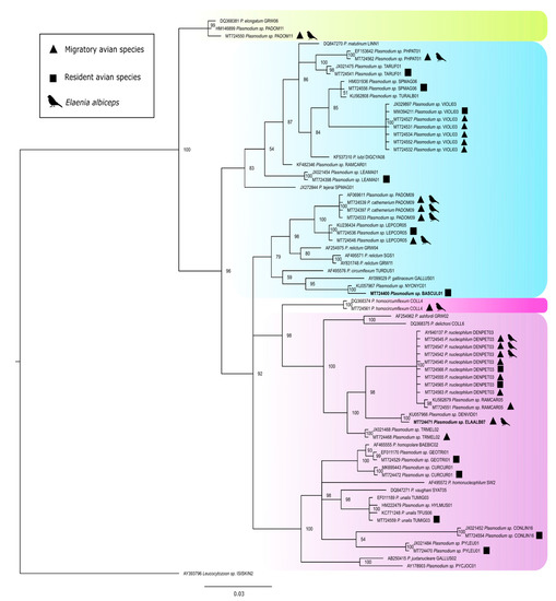 Bayesian phylogeny based on the partial cytb mitochondrial gene sequences of Plasmodium species. Leucocytozoon sp. was used as the outgroup. The support values of the nodes (in percentage) indicate posterior probabilities. The yellow box indicates the lineages and species of the subgenus Huffia, the blue box indicates the lineages and species of the subgenus Haemamoeba, the light pink box indicates the lineages and species of the subgenus Novyella, and the dark pink indicates the lineages and species of the subgenus Giovannolaia. The lineages reported during the present study were identified by the symbols “triangle” and “square”, for migratory and resident species, respectively. Lineages given in bold refer to new lineages.