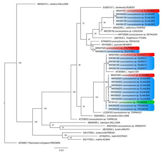 Bayesian phylogeny based on the partial cytb mitochondrial gene sequences of Leucocytozoon species. Plasmodium elongatum was used as the outgroup. Node support values (in percentage) indicate posterior probabilities. In blue the position of the lineages found in this study. In red, lineages described in Argentina, and in green, lineage described in Colombia.