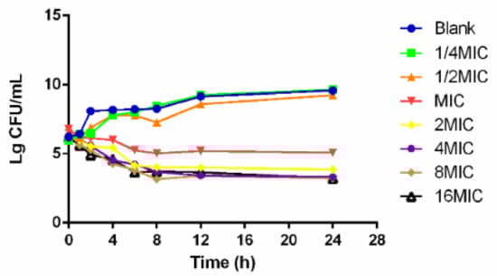 The time–killing curves of cefquinome against HPS42 in vitro and ex vivo are shown in Figure 2 and Figure 3. The curves showed a time-dependent antibiotic activity and the optimal bactericidal activity showed a threshold of approximately 4 × MIC. A further increase in the concentration resulted in a similar efficacy [23,24].