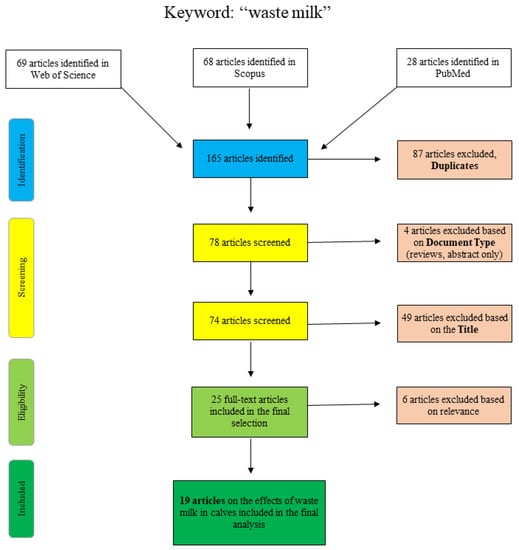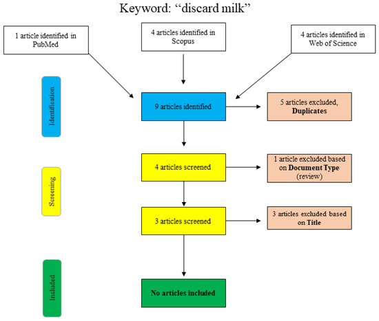 A further search for the term “discard milk” is shown graphically in Figure 2. In PubMed, the search was performed using the search term “discard milk” and the limitation to “species: other animals”. The articles in Scopus and Web of Science were found using “title/abstract/keywords: ‘discard milk’”. The three final articles that were excluded with respect to the title were clearly not relevant to the topic of this narrative review, and no additional articles were included.