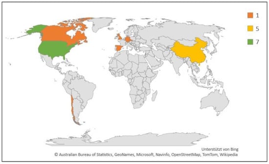 Geographic and numerical distribution of studies included in this review (N = 18). Legend indicates number of studies.