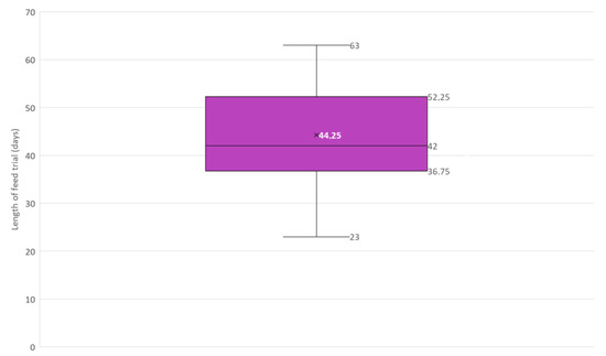 Box and whisker plot of the length in days of feed trials included in this narrative review (N = 12). × = mean, horizontal line = median (Q2), box = the range between the 1st (Q1) and 3rd (Q3) quartile; lower whisker, Q1 − 1.5 (IQR) (interquartile range); upper whisker, Q3 + 1.5 (IQR).