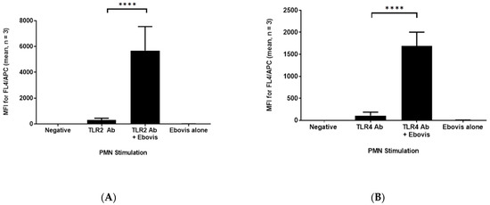 Interestingly, though, we observed a repeated effect on the staining of TLR2 and TLR4 using the same directly labeled antibodies. In the absence of E. bovis, there was a relatively low surface expression of both TLRs, and neither of the directly labeled antibodies bound to CSFE-labeled E. bovis on its own. However, incubation of PMN with CSFE-labeled E. bovis seemed to significantly increase the detection of both TLR2 and TLR4 on the cellular surface (Figure 2A,B, respectively, p < 0.0001).