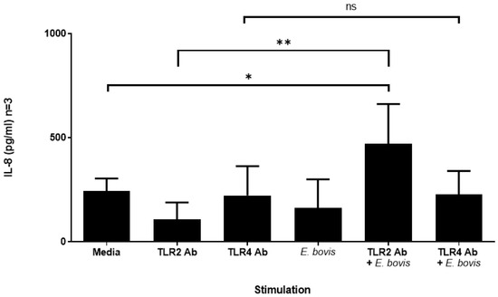 2.2. Exposure of Bovine PMN to E. bovis Increases IL-8 Secretion in the Presence of TLR2 Antibodies