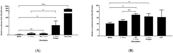 To assess TLR recognition of E. bovis-derived antigens (EbAg), HEK cells expressing bovine TLR2 or bovine TLR4 containing an NF-κB luciferase reporter (NF-κB-luc, Promega, Chilworth, Hampshire, UK) were used [56,72,73]. Briefly, HEK-TLR2 or HEK-TLR4 cells were seeded at a density of 2.5 × 105 cells in 6-well plates using Dulbecco’s Modified Eagle Medium (DMEM Life Technologies, Paisley, Renfrewshire, UK) supplemented with 10% fetal bovine serum (FBS, Life Technologies, Paisley, Renfrewshire, UK) and 1 mg mL−1 Geneticin (Life Technologies, Paisley, Renfrewshire, UK). After 24 h, HEK cells were transfected with 250 ng p NF-κB-luc with TurboFectTM (Thermo Scientific, Waltham, MA USA) using the manufacturers’ standard recommendations and allowed to recover for 24 h. For experimental assays, one well of a 6-well plate was split into 6 wells of a 24-well plate and each condition was assayed in triplicate. HEK-TLR2 and HEK-TLR4 cells were exposed to E. bovis stimuli: live 2.5 × 105; dead 2.5 × 105 heat killed (60 °C, 30 min) and soluble EbAg 100 µg for 24 h with TLR2 (1 µg mL−1 Pam3CSK4), TLR4 (1 µg mL−1 LPS-EK) and NF-κB [100 ng mL−1 phorbol 12-myristate 13-acetate (PMA)] controls (all Invivogen, Toulouse, Midi-Pyrenees, France). NF-κB gene activation was determined using the Luciferase Reporter Assay System (Promega Chilworth, Hampshire, UK) following the manufacturer’s instructions. Cell lysates were clarified by centrifugation at 16,000× g for 5 min and protein concentration determined by absorbance at 280 nm with a Nanodrop ND-1000 for normalization, as described [74].