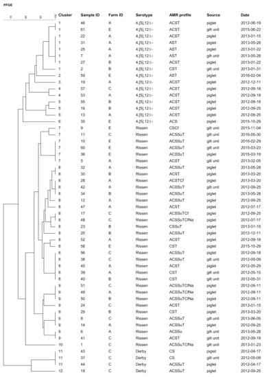 In the case of isolates from piglets, genetically similar serotypes were detected on several occasions within the same farm and sometimes more than 150 days apart (i.e., S. 4,[5],12:i:- and S. Rissen in farm A, S. Rissen in farm B, and S. Rissen and S. Derby in farm C).