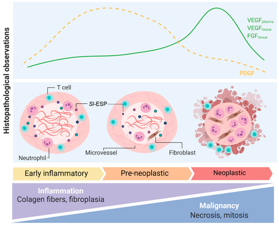 Pathogenic mechanisms observed in S. lupi-induced nodules in the dog’s esophagus. Histopathological observations, blood and tissue growth factors and overall changes in early-inflammatory, pre-neoplastic and neoplastic esophageal spirocercosis nodules. FGF: fibroblast growth factor; PDGF: platelet-derived growth factor; Sl-ESP: excretion–secretion products derived from S. lupi; VEFG: vascular endothelial growth factor. This figure was created using Biorender.com.