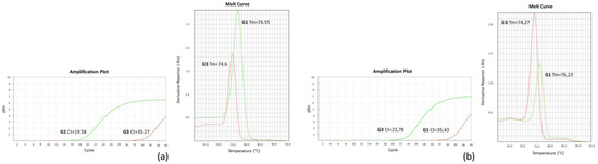 The method, already described by other authors [24,29], was carried out using two forward primers with varying nucleotide at its 3’ end, specific to each SNP, and a common reverse primer. A mismatched base before 3’ end of the forward primers was incorporated to increase the specificity of the PCR. Short 6-bp and long 14-bp GC tails were added at the 5’end of each forward primers to produce amplicons of different lengths and melting temperature. Primers were designed using the online software, NetPrimer (Premier Biosoft, San Francisco, CA, USA). The sequence and characteristics of primers used are reported in Table 1. No primers were found by NetPrimer for SNP 758. Two reaction mixtures were prepared for each SNP-based assay differing for the presence of the forward primer specifically designed for G1 and G3 genotypes DNA sequence. PCR amplification was performed in a volume of 20 µL in two distinct wells containing, respectively 0.1 µM of forward primer and 0.1 µM common reverse primer for each SNP, 1x Power SYBR Green master mix (Thermo Fisher, Waltham, MA, USA) and 50 ng of DNA template. Real time PCR and Melting Curve Analysis were carried out using 7500 Fast Real Time PCR System (Thermo Fisher, Waltham, MA, USA) with the following protocol: initial denaturation 95°C for 10 min, followed by 45 cycles of 95 °C for 15 s, 54 °C for 30 s, 60 °C for 1 min. The amplicon Tm was obtained collecting fluorescence data from 60 °C to 95 °C following the default instrument conditions. G1 and G3 genotypes were distinguished by their Ct and Tm values as previously reported [24]. Briefly, sample results were examined on the PCR products characteristics of two wells, one for each forward primers of different length. G1 specific forward primer produced a longer amplicon than G3 specific primer. Amplicons with higher Tm were considered G1, whereas samples with lower Tm values were identified as G3. Only the amplifications with Ct < 30 were considered for the analysis. This cycle threshold value was chosen on the basis of the results obtained in repeated trials with all the samples analyzed in this study and confirmed by DNA sequencing analysis. In Figure 1 a representative SYBR green PCR analysis of G1 (Figure 1a) and G3 genotype (Figure 1b) samples is illustrated.