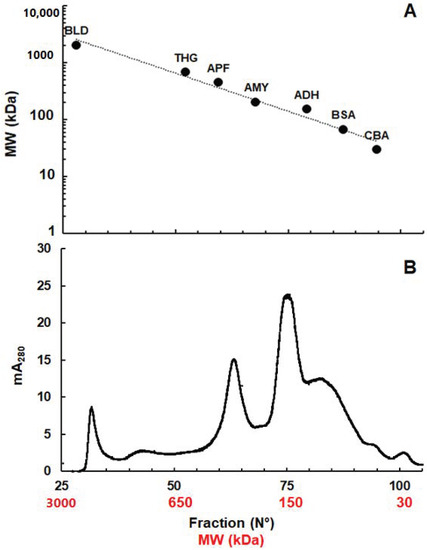 Separation of soluble proteins from G. lamblia crude extracts by size exclusion chromatography. (A) Calibration curve using a marker panel, namely blue dextran (BLD, 2000 kDa), thyreoglobulin (THG, 670 kDa), apoferritin (APF, 443 kDa), amylase (AMY, 200 kDa), alcohol dehydrogenase (ADH, 150 kDa), bovine serum albumin (BSA, 66 kDa), and carboanhydrase (CBA, 29 kDa); (B) G. lamblia proteins. Size exclusion chromatography was performed as described in the Materials and Methods section.