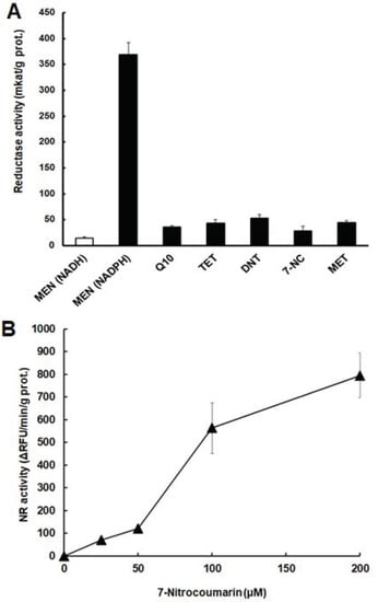 In the next step, NR activities were measured in the fractions obtained as described above using either NADH or NADPH as electron donors and MTT as a final electron acceptor. Moreover, NR activity was directly measured using 7-nitrocoumarin as a substrate (Figure 2).