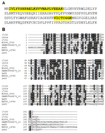 Interestingly, pools 5 and 6 contained a previously uncharacterized quinone reductase homologous, namely, a protein encoded by ORF 17150, as identified by the peptides shown in Figure 4A. ORF 17150 encodes an 18 kDa polypeptide with two homologs in the Giardia genome, namely 15004 (86.6% identity) and 17151 (44.2% identity). Two overlapping peptides (SVVNAPLVEAAK+SVVNAPLVEAAKK) were detected for 15004 (Table S1). Peptides encoded by ORF 17151 could not be detected in our dataset. Furthermore, 17150 aligned to the putative NADPH quinone reductase (BC643_3700) from Mangrovibacterium diazotrophicum (43% identity), the Kef-type potassium/proton antiporter accessory protein (SAMN05444274_104409) from Mariniphaga anaerophila (34.9% identity), the glutathione-regulated potassium-efflux system ancillary protein (kefG CFU_0384) from Collimonas fungivorans (39.1% identity), the flavodoxin family protein (EXU30_14760) from Shewanella maritima (36.1% identity), and the general stress protein 14 (ywrO BSU35990) from Bacillus subtitlis (40.1% identity). Alignments are depicted in Figure 4B.