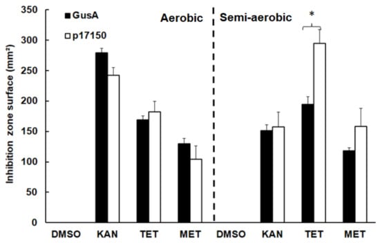 Susceptibility of E. coli BL21(DE3) expressing glucuronidase A as a control (GusA), or protein 17150 (p17150) to tetracycline (TET), metronidazole (MET), or kanamycin (KAN). Lines were plated, discs containing the drugs were added, and plates were incubated under aerobic or semi-aerobic conditions. After 16 h, diameters of inhibition zones were determined, the surfaces of inhibition zones were calculated, and the values were processed as described in the Materials and Methods section. Mean values ± standard errors correspond to four independent replicates. Values marked by an asterisk are significantly different between p17150 overexpressors and GusA controls (two-sided t-test; p < 0.01).