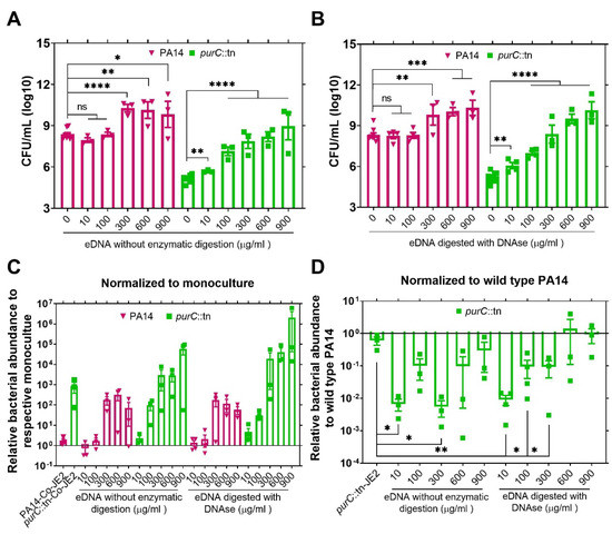 Exogenous DNA provides a nutrient source for P. aeruginosa and can rescue the growth of a purine-deficient mutant. (A) Bacterial cells were incubated with 10 to 900 µg/mL herring DNA, as an exogenous purine source, without enzymatic digestion. (B) Bacterial cells were incubated with 10 to 900 µg/mL herring DNA with enzymatic digestion. (C) Relative bacterial abundance of wild-type and purine-deficient mutant (purC::tn) of P. aeruginosa in co-culture with JE2 or exogenous DNA. Cells in co-culture with JE2 or eDNA were normalized to the respective numbers in monoculture. (D) Relative fitness of purine-deficient mutant (purC::tn) of P. aeruginosa in co-culture with JE2 or eDNA compared to the growth of wildtype P. aeruginosa, PA14, in co-culture with JE2 or eDNA, respectively. Here, the relative numbers of purC::tn mutant were calculated by normalizing to the wild-type PA numbers in respective co-culture conditions. Error bars represent SEM of data derived from at least three biological replicates on different days, and experiments were performed in technical triplicates each day. The statistical comparison was done between the purC::tn mutant and PA14 strains (not shown here) in their respective co-culture conditions. Here, ‘’*’’ designates p < 0.05, ‘’**’’ designates p < 0.005, ‘’***’’ designates p < 0.0005, ‘’****’’ designates p < 0.0001 depicted by two-tailed unpaired Student’s t-test, and ns denotes not significant. The concentration of the exogenous DNA is in µg/mL.