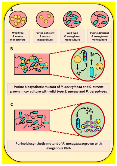 An analysis of the essential genes of P. aeruginosa grown in sputum media showed that purines, along with 45 other metabolites, are molecules that are likely to be critical during late-stage infection due to their minimal bioavailability in the CF lung environment [11]. Purines are essential for numerous cellular activities in P. aeruginosa and hence could be a possible metabolite that could be exchanged between CF pathogens. The deoxy form of purine diphosphate derivatives is used as a precursor for DNA synthesis, and purine monophosphates are synthesized newly by de novo synthesis or recycled from nucleic acid turnover by salvage pathway [12]. In P. aeruginosa, inosine monophosphate (IMP), the precursor in purine biosynthesis, can be synthesized from 5-phosphoribosyl-1-pyrophosphate (PRPP) by a de novo biosynthesis pathway involving 11 enzymatic steps. These essential enzymes are encoded by different genes such as purC, purD, purK, etc. Finally, adenosine- and guanosine-monophosphates can be synthesized from IMP separately [13,14]. In this study, we have conducted co-culture experiments with purine auxotrophic strains to investigate whether purine deficiency can be bi-directionally exchanged between P. aeruginosa and S. aureus as proof-of-principle that metabolic complementation can occur between these classic competitors.
