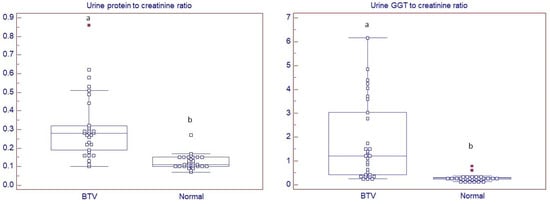Dot and box and whisker plots of urine protein to creatinine ratio and urine gamma-glutamyl transpeptidase (GGT) to creatinine ratio determined in sheep with (Bluetongue virus (BTV); n = 30) and without (normal; n = 30) clinical signs of bluetongue and without active sediment. a,b Different superscripts are indicative of statistically significant difference. (p < 0.05).