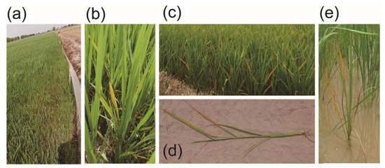 Field observations of potential rice orange leaf phytoplasma (ROLP)-infested paddies in Cambodia. (a) and (b) Yellowing rice plants with impaired growths. (c,d) Rice plants showing orange discoloration directed downward from the tip. (e) A rice plant showing progressed leaf senescence and death.