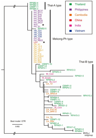 The current study detected a considerable number of ROLP-infected rice plants (236 samples out of 295 plants tested) in the Philippines, Vietnam and Cambodia from 2015 to 2019 (Table 1) and confirmed that these are associated with insect vectors ZLH and GLH in Cambodia (Table 2). A series of surveys were triggered by the first observation of ROLD by our team in Laguna, the Philippines, in 2015 and that in Svay Rieng, Cambodia in 2016. At this stage, ROLP in Cambodia was expected to have migrated from Vietnam [22]. Together with the reported ROLP 16S rRNA gene sequences from Thailand, India, Vietnam, the Philippines and South China [3,18,21,22,23,28], those of the Philippines, Vietnam and Cambodia analysed in this study were phylogenetically assessed for the first time (Figure 3). It was found that isolates in India, Cambodia and Thailand were more diverse than those in other countries, and thus these may be considered as autochthonous genotypes of ROLP in these areas or international translocation-resultant isolates. Although further analysis is required, it is anticipated that the potential origin of ROLP is Thailand because of its rich genetic diversity (Figure 3). Additionally, probable spread of a single population in Cambodia, Vietnam, China and the Philippines was assumed based on the distribution of the Mekong-Ph type ROLP in these countries as shown in Figure 7 (red stars). Indeed, the evolutional relationship between the Chinese and Indian isolates is far apart; the disease outbreaks in these countries may not be attributed to the genetic commonality of ROLP. To our knowledge, ROLP can be found commonly in the paddies of Asian countries; thus, the pathogen is expected to be more broadly present in rice cropping countries today. To further understand the genetic variations of ROLP, disease surveys must be conducted more widely together with genotyping of the pathogen by sequencing of 16S rDNA and multilocus house-keeping genes [26,29,30] or even by genome-wide comparisons.