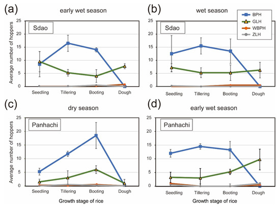 Total number of selected leafhoppers and planthoppers in different locations and seasons in Cambodia. (a) Total counts of brown planthopper (BPH), white backed planthopper (WBPH), zig-zag leafhopper (ZLH) and green leafhopper (GLH) at seedling, tillering, booting and dough stages of rice in a paddy located in Sdao, Cambodia, during the early wet season. (b) Insect count in the same paddy as (a) during the wet season. (c,d) Total insect count in a paddy located in Panhachi, Cambodia, during the early wet (c) and dry seasons (d).
