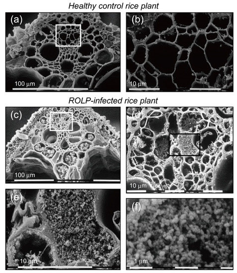 In the ROLP-infected rice plant, drastic physiological changes occur. Thick sections of rice leaf blade were prepared and observed under a scanning electron microscope (SEM) to assess the changes in plants. The major difference between healthy and diseased rice plants is the massive accumulation of starch-like granules in the ROLP-infected rice leaf (Figure 6). In the vascular bundle sheath and parenchyma of the ROLP-infected rice, compacted, amorphous blobs of possible storage starch were observed (Figure 6c), while a very low amount was seen in healthy plants (Figure 6a). Similarly, in the phloem’s enclosed view, particle compaction was observed only in the ROLP-infected rice (Figure 6b,d). The sizes of these particles appeared to be very small (100–200 nm in diameter), and this range agrees with the general size of the phytoplasma (80–800 nm in diameter) (Figure 6e,f). These obvious changes are associated with ROLD symptoms, such as leaf discoloration, growth inhibition and fast senescence.