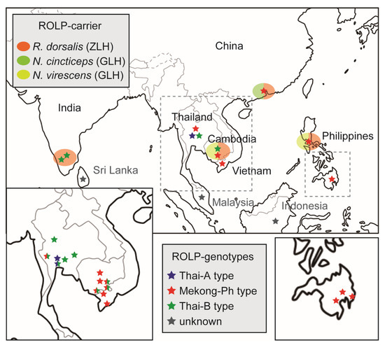 Geographic distribution of three ROLP subgroups in Asian countries. Presence of phylogenetically separated three subgroups (genotypes) of ROLP are differentiated by stars with blue (Thai-A type), red (Mekong-Ph type) and green (Thai-B type) in each country in the main map. Those of previously reported ROLP with no genetic information are shown by a grey star. Enclosed mappings of ROLP distribution in Vietnam/Cambodia/Thailand and the Philippines are shown; each star in these enclosed maps represents different provinces and stars with mixed colours indicate detection of different ROLP subgroups in a province. Confirmed ROLP-carrying insects are shown by circles with different colours as indicated.