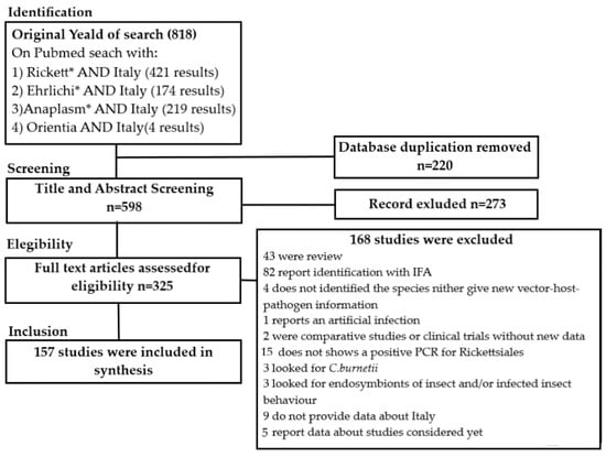 For the writing of this review a computerized search without language restriction was conducted using PubMed. The search was performed combining the terms “Ricketts * AND Italy”, “Ehrlichi * AND Italy” and “Anaplasma AND Italy”, Orientia AND Italy”. The Preferred Reporting Items for Systematic Reviews and Meta-Analyses (PRISMA) methodology was followed [7]. Only studies that provided data about Rickettsiales identified by molecular methods in Italy were included in the review. All molecular methods which reached the species level were considered. A flow chart summarizing the literature research approach is reported in Figure 1.
