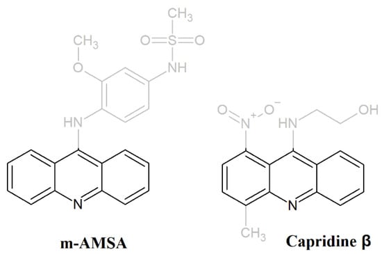 1-Nitro-9-aminoacridine derivative Capridine β, 9[2′-hydroxyethylamino]-4-methyl-1-nitroacridine (also known as C-1748) (Figure 1), similar to m-AMSA, exhibited anti-cancer and antifungal properties [14,15,16]. Moreover, previous studies, performed for Capridine β in cancer cell cultures and human xenograft animal models indicated a high therapeutic index and low cytotoxicity with the potential for clinical development [14,15,17,18,19]. Both compounds, m-AMSA, as well as Capridine β, contain an acridine chromophore (Figure 1).