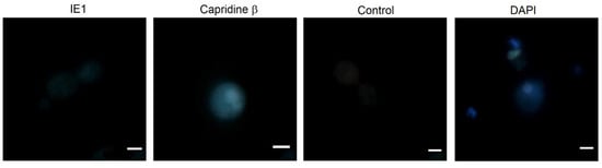 The background-corrected fluorescence spectrum of IE1, obtained in vitro, indicates the highest fluorescence intensity of this compound compared to others (Figure 6) at the excitation wavelength used for microscopic analysis (410 nm) and the same emission range (>450 nm). As it can be seen in Figure 5, the pattern of accumulation for Capridine β seems to be similar to DAPI (4,6-diamidino-2-phenylindole). DAPI staining of C. albicans is commonly used to localize the nucleus [21]. Thus, probably the Capridine β targeted structure is a nucleus. According to the previously published studies, an interaction with DNA was observed [14,15,18,22]. Despite the higher IE1 fluorescence intensity, than measured for Capridine β (Figure 6), no fluorescence for that compound was detected within the fungal cells, neither in the cytoplasm nor in the nucleus (Figure 5). Hence, no antifungal activity seems to be the result of an impossibility of reaching the molecular target.