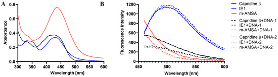 (A) UV/vis absorption spectrum of 0.1 mM Capridine β, IE1 or m-AMSA in PBS. (B) Background-corrected fluorescence spectra of 0.05 mM Capridine β, IE1, and m-AMSA at the excitation wavelength of 410 nm without (solid line) and with DNA-1 (dashed line) and DNA-2 (dotted line) sequences. Data shown are corrected for background fluorescence and represent averages of at least three replicate samples.