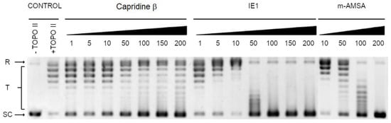 The most effective IE1 totally inhibited the yeast topoisomerase II-mediated relaxation at concentrations lower than detected for m-AMSA (Figure 7). The inhibition activity of the analyzed compounds was determined by densitometry quantification of the transition from supercoiled to relaxed forms and was expressed in relation to the control. The half maximal effective concentration (EC50) refers to the concentration of a drug, which affected the relaxation in 50%. EC50 determined for IE1 and m-AMSA was 14.1 ± 1.2 μM and >200 μM, respectively. Interestingly, the closely related Capridine β slightly diminished the catalytic activity of topoisomerase II but no complete inhibition was observed in the tested concentration range.